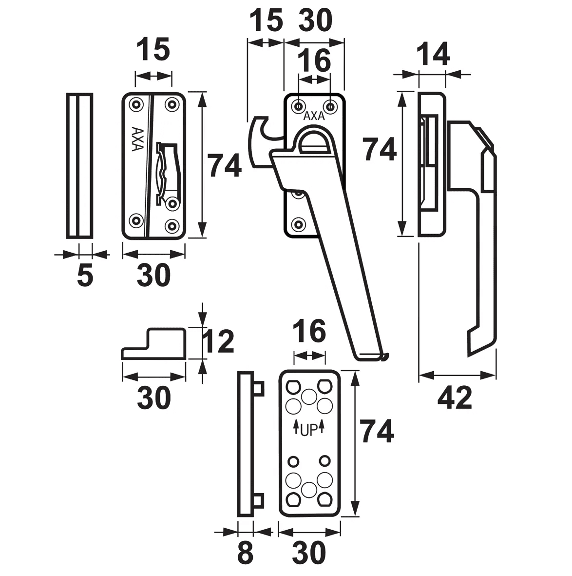 AXA 3318-51-92/BL Raamsluiting knop vergrendeling F2 Rechts compleet sluitkom / onderlegplaat / schroeven