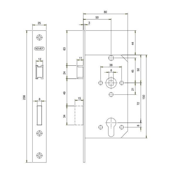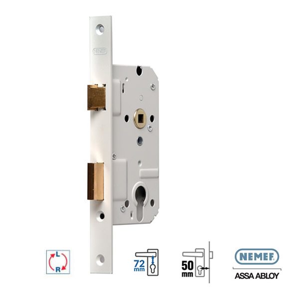met een afstand van 72 mm. (Bijv. Nemef deurslot 66/2) - Dit slot kan op een naar binnen- of naar buitendraaiende deur